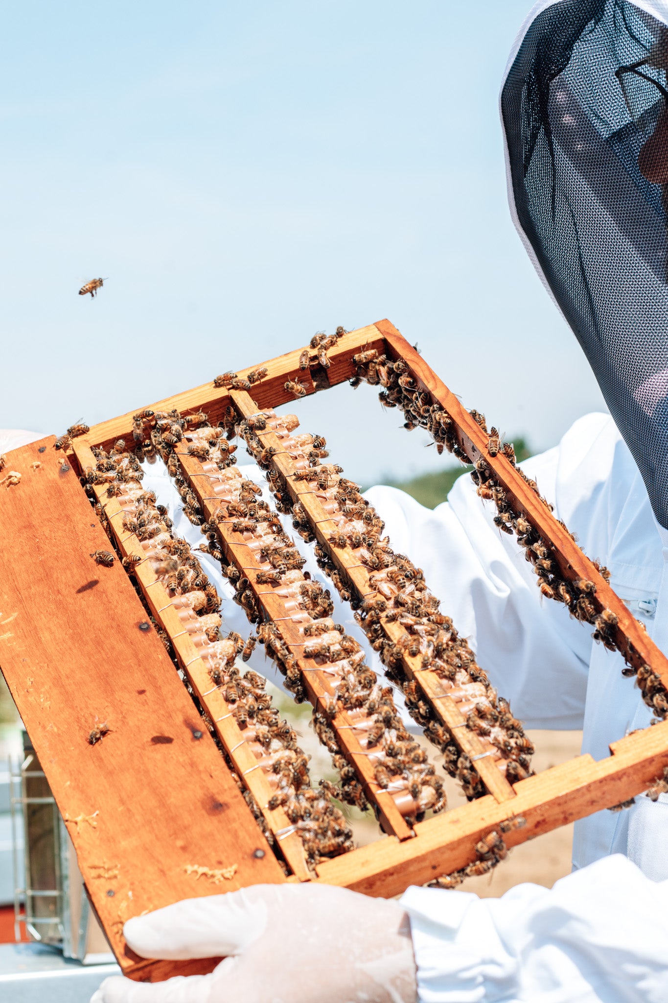 L'apiculteur identifie des larves de haute qualité provenant de colonies d'abeilles saines. Ces larves sont choisies en fonction de leur âge et de leur potentiel génétique pour devenir des reines productrices de gelée royale.